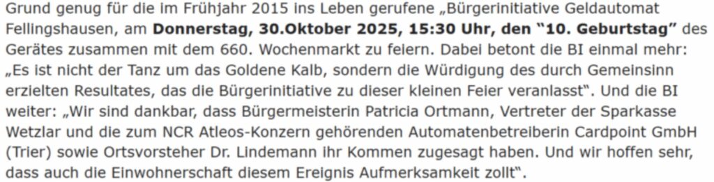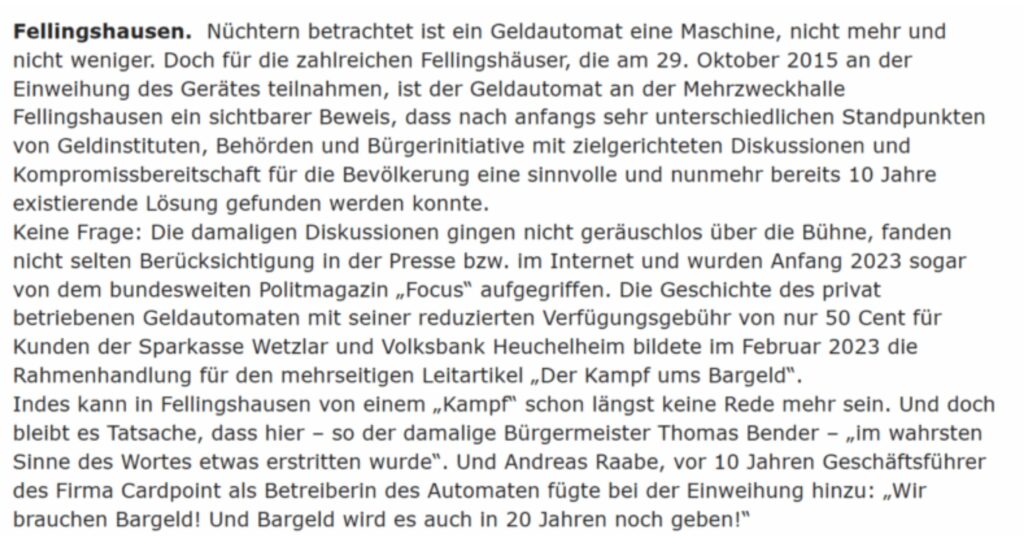 Die Bürgerinitiative „Geldautomat Fellingshausen“ setzte sich dafür ein, dass nach Schließung der Sparkassenfiliale im Ort der private Geldautomat aufgestellt wurde, so dass Bargeld für die Bürger verfügbar bleibt, wenn schon für alle anderen Bankleistungen mittlerweile ein hohes Maß an Eigenarbeit der Kunden erwartet wird.