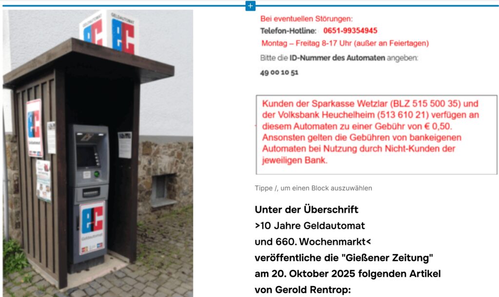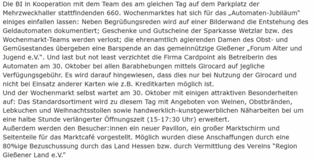 .. an der Mehrzweckhalle in Fellingshausen, Rodheimer Str. 24; nahe dem allwöchentlichen Wochenmarkt hinter der MZH, der Ende Oktober 2025 seine 660. Auflage feiern kann. Nachdem der REWE-Markt in Fellingshausen geschlossen wurde, hat sich die Initiative „Fellingshäuser Wochenmarkt“ daran gemacht, diese Einkaufsmöglichkeit mit Marktbeschickern zu organisieren und einen Treffpunkt im Dorf mit Stammtisch und Kuchen-Buffett zu schaffen.