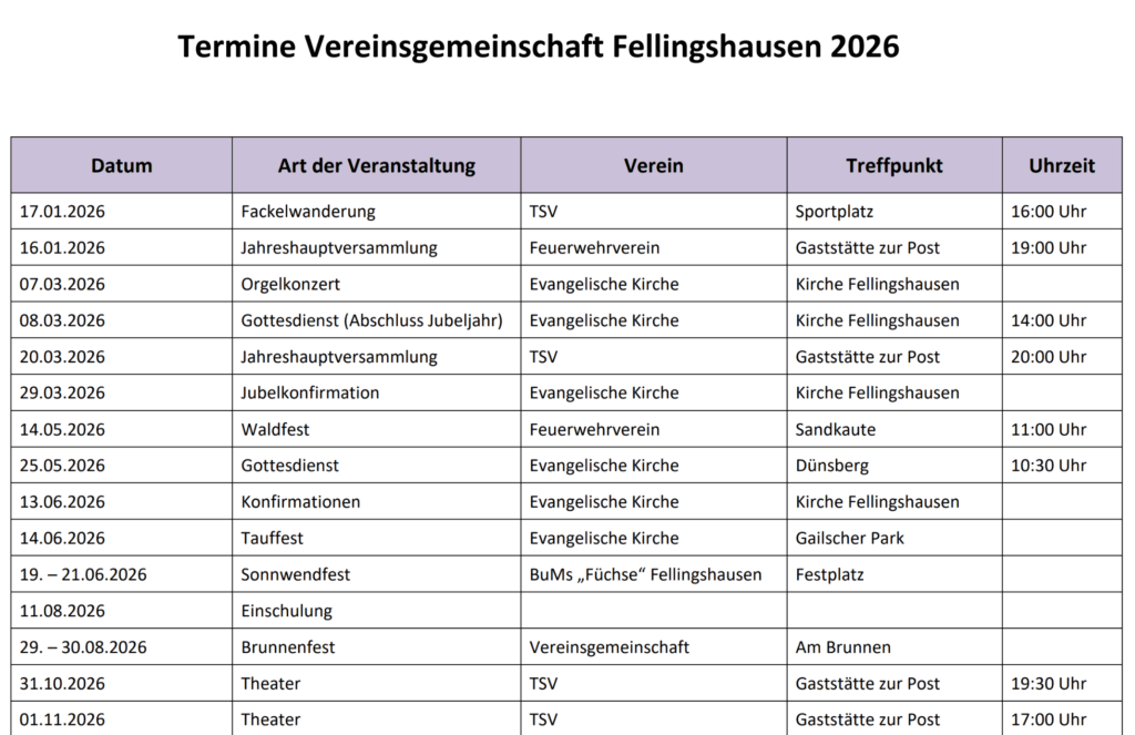 Fellingshausen, Feste, Informatives, Musik, Sehenswert, Veranstaltung, Vereine Termine 2026 in Fellingshausen Dr. Alfons Lindemann 19. November 2025 Share: Facebook X