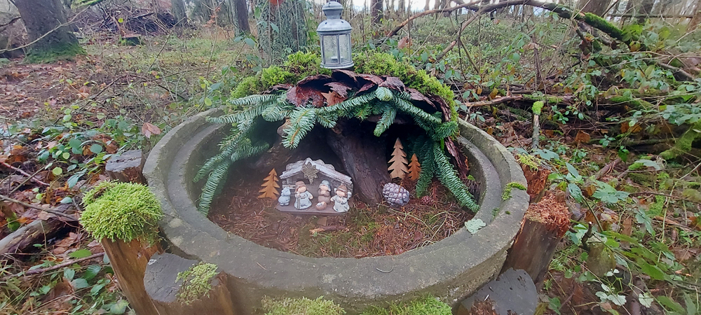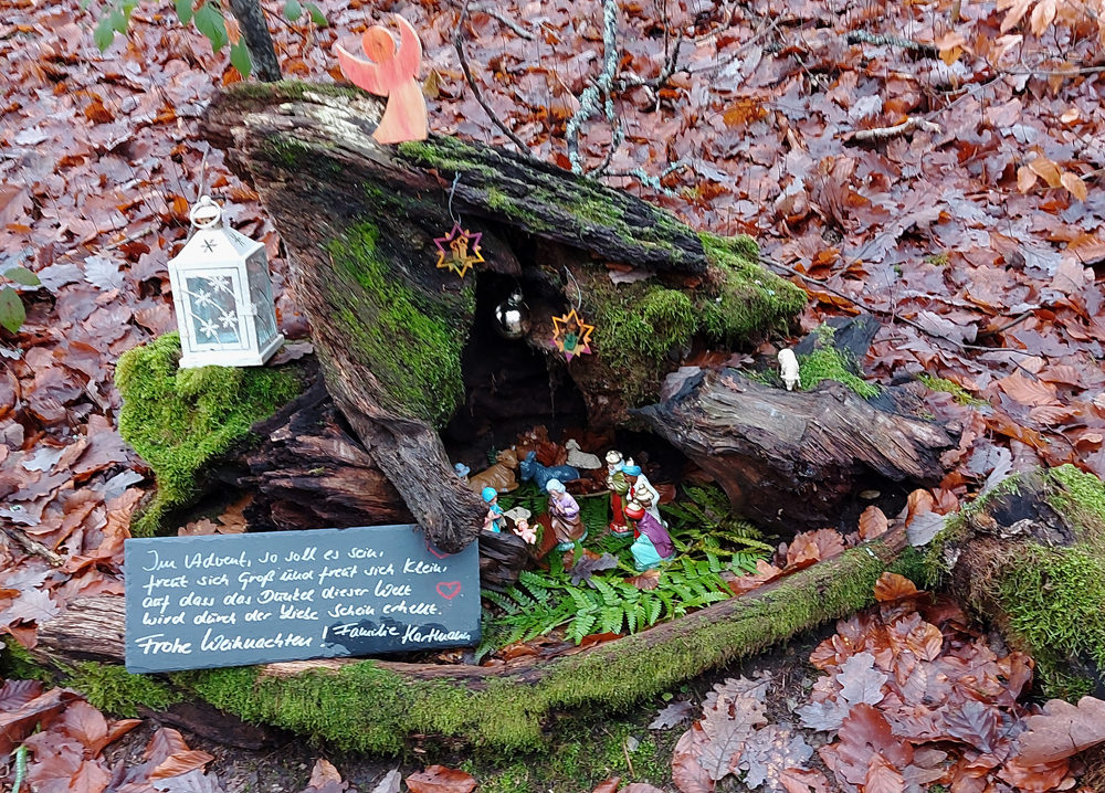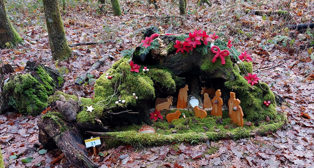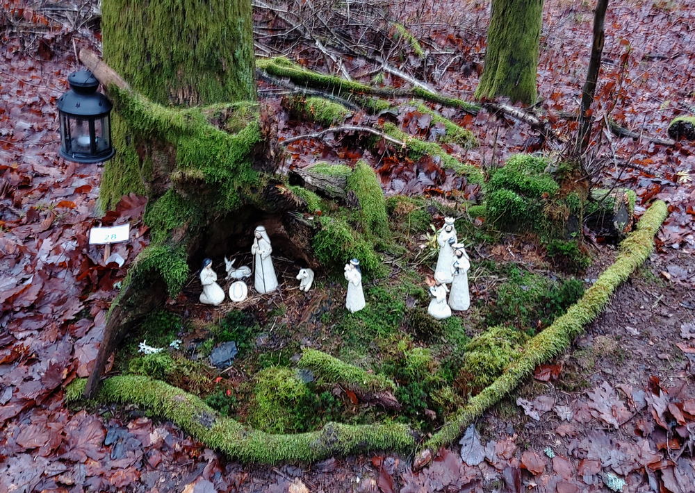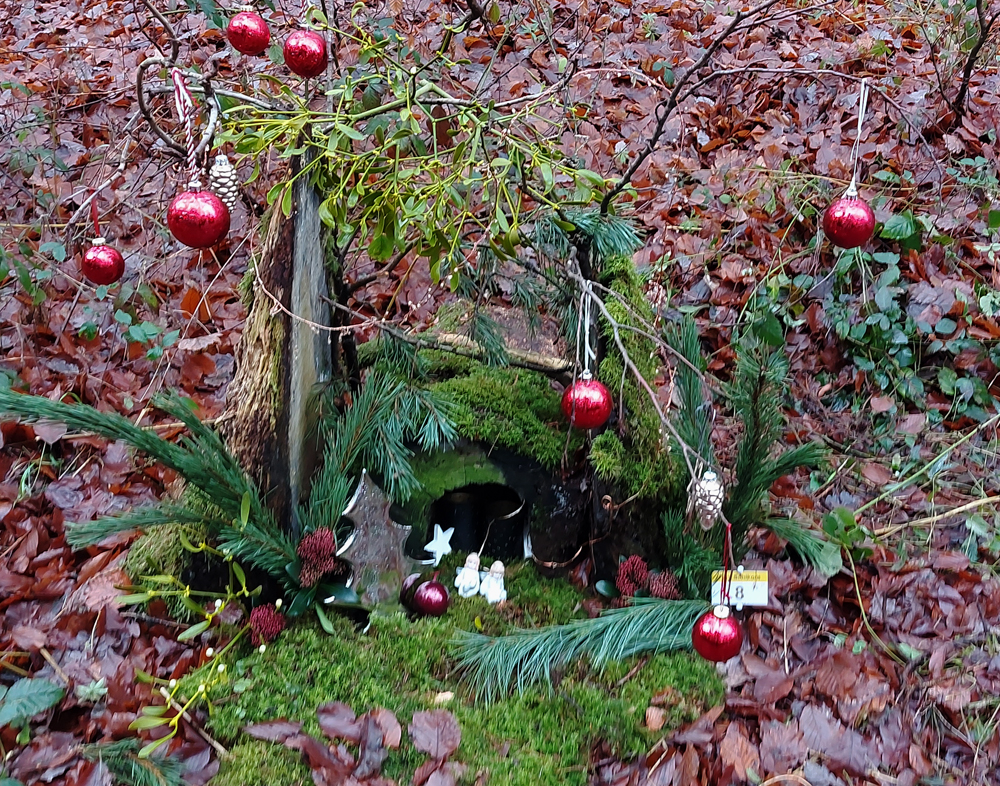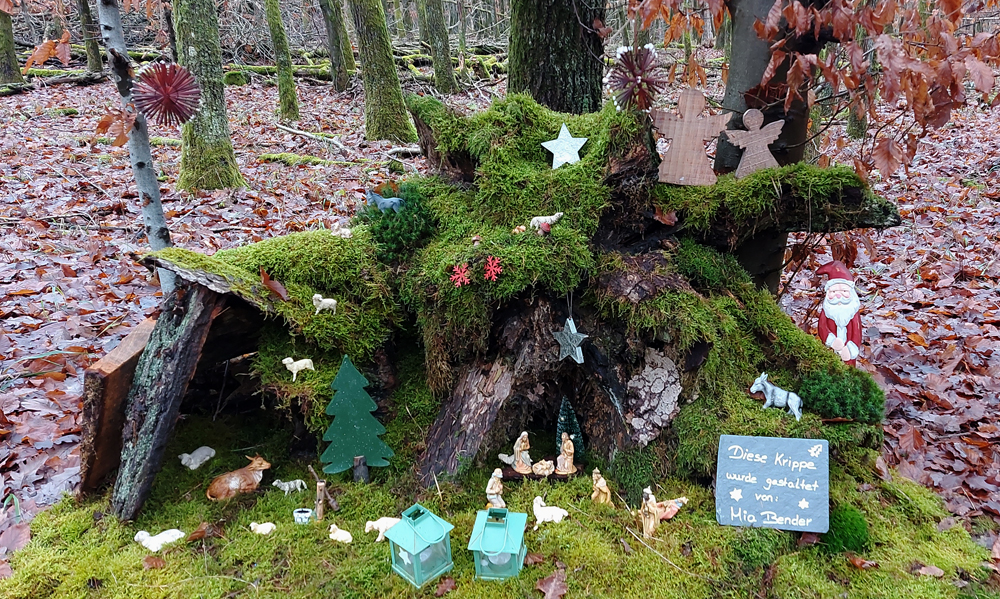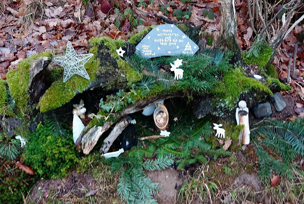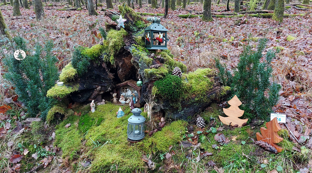 Beim Tippen auf das Foto kann es so vergrößert werden, dass man Details besser sieht. Dann sind auch Texte und die Namen derjenigen, die die Krippe gestaltet haben, besser zu lesen. Auffällig ist die Krippe im Rohr am alten Stollen. Und die Krippe von Evenius steht seit Jahren hier und gegenüber einer Bank. Schade, ein paar Bänke mehr wären auf diesem Weg vor allem für uns Ältere wünschenswert. Vielleicht kann die Holzwerkstatt da Abhilfe schaffen.