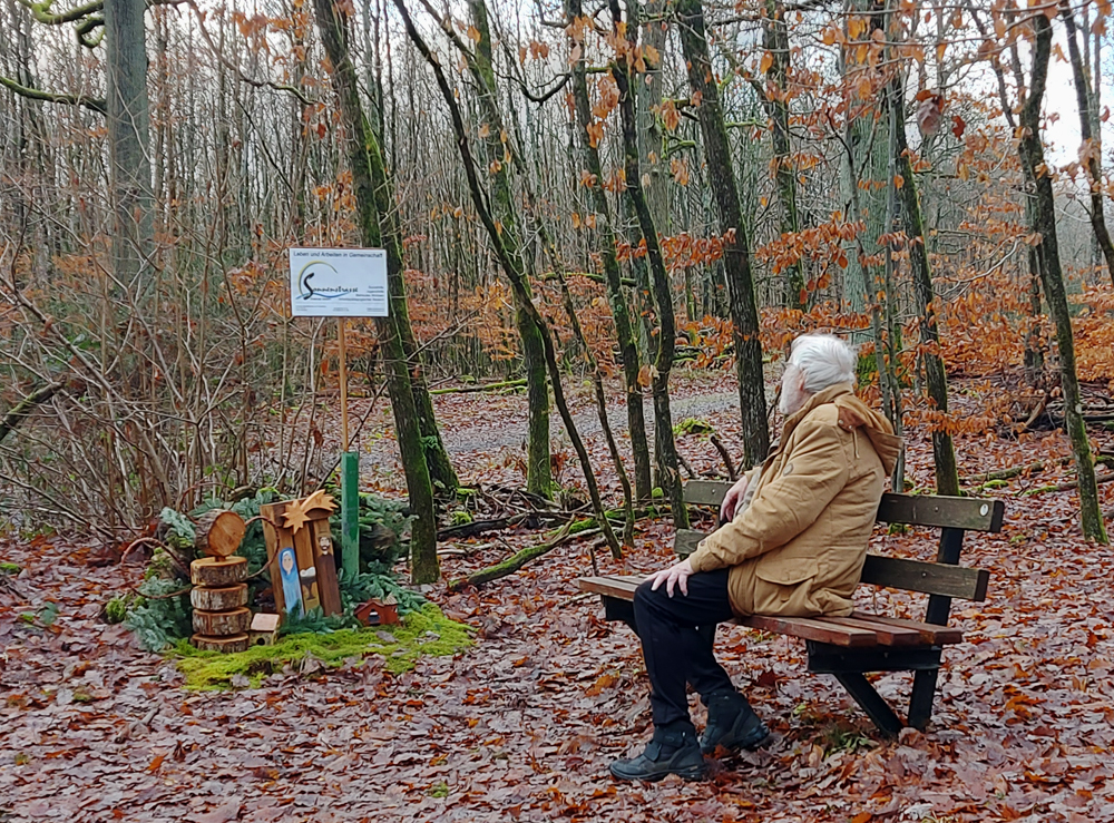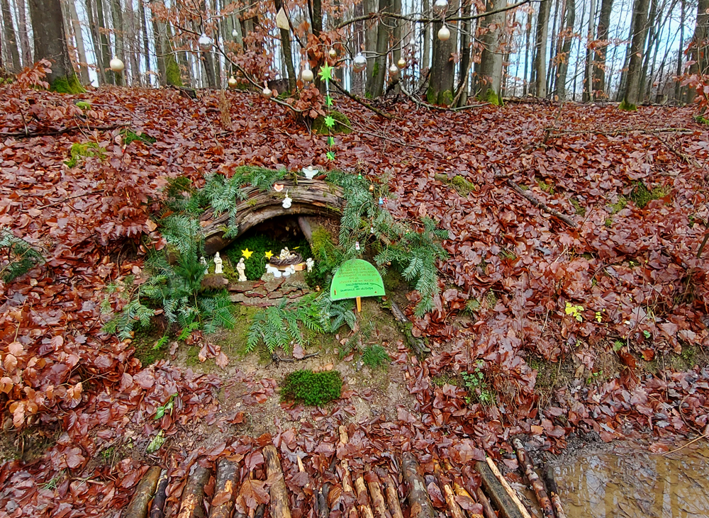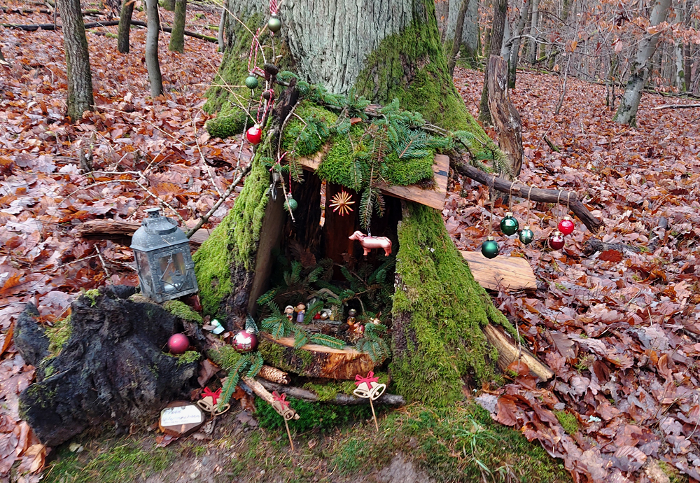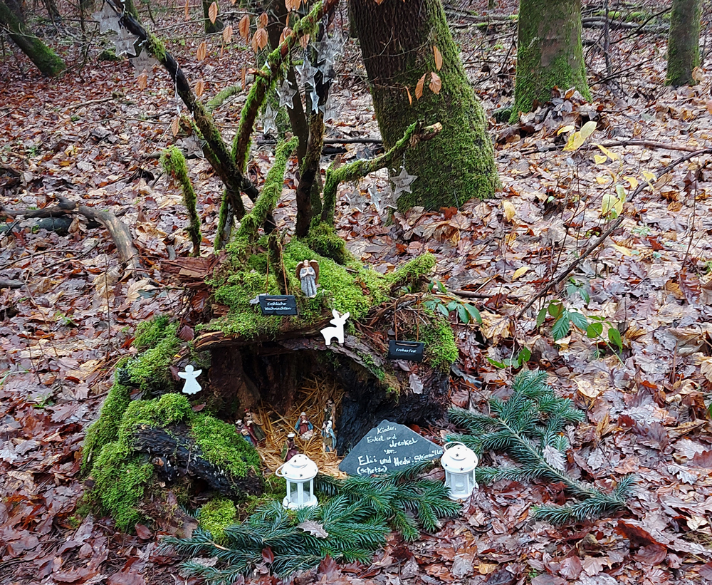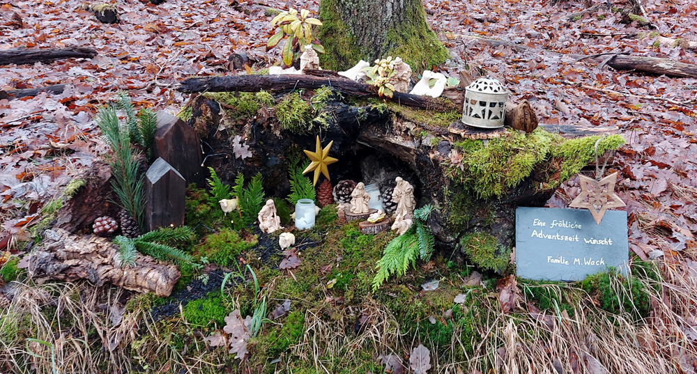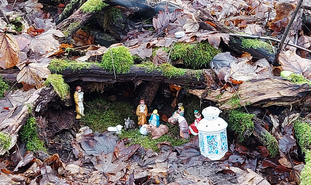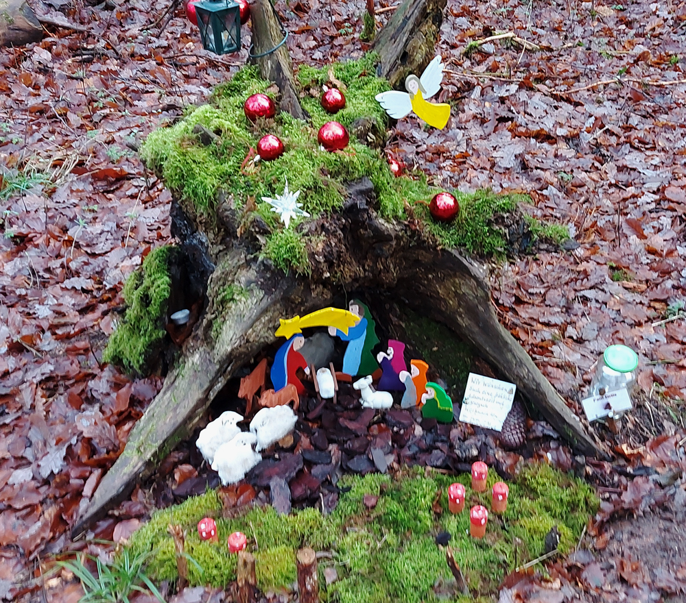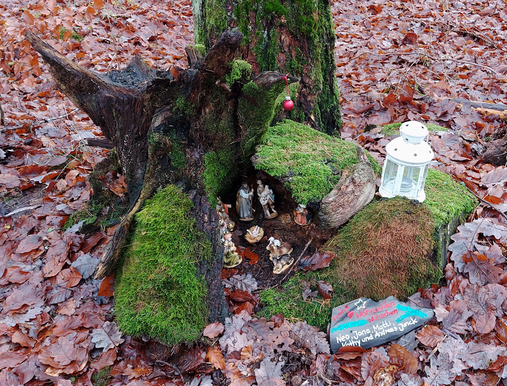 Beim Tippen auf das Foto kann es so vergrößert werden, dass man Details besser sieht. Dann sind auch Texte und die Namen derjenigen, die die Krippe gestaltet haben, besser zu lesen. Auffällig ist die Krippe im Rohr am alten Stollen. Und die Krippe von Evenius steht seit Jahren hier und gegenüber einer Bank. Schade, ein paar Bänke mehr wären auf diesem Weg vor allem für uns Ältere wünschenswert. Vielleicht kann die Holzwerkstatt da Abhilfe schaffen.
