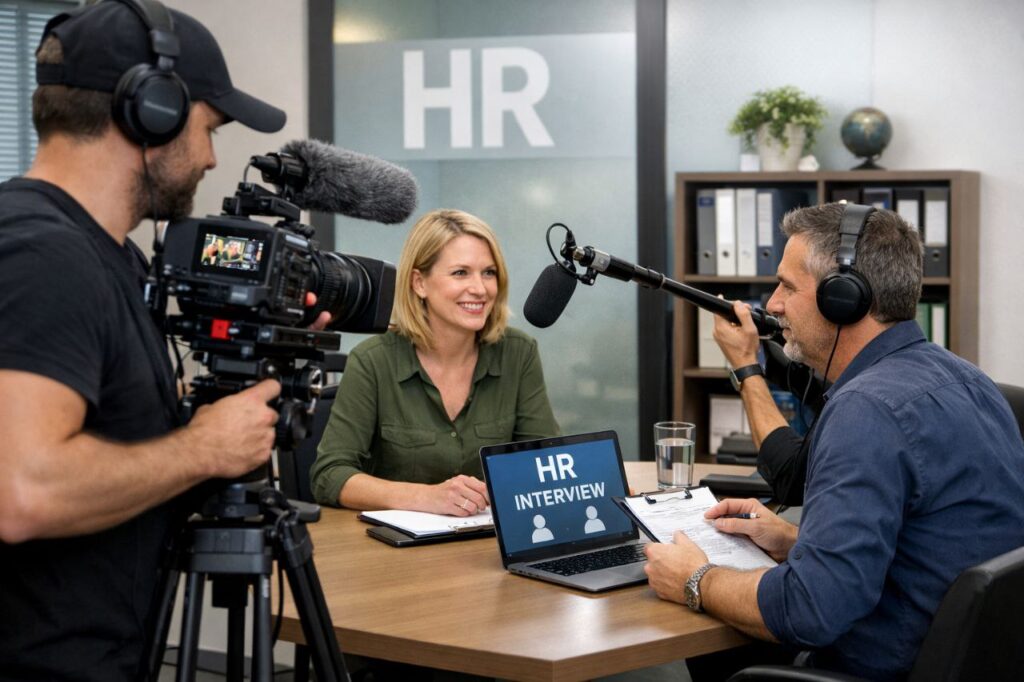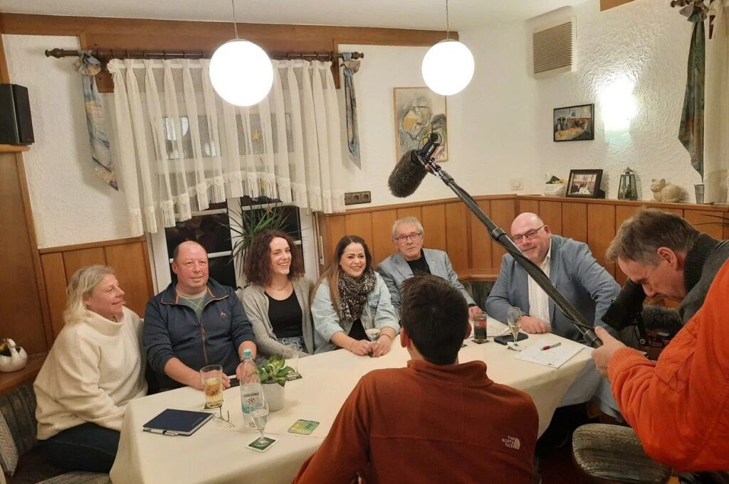 Als auch nach Jahren noch immer nicht reportertauglich auf Zack habe ich gestern (9. Febr. 2026) beim Treffen der Ortsbeiratskandidat/innen in der „Post“ in Fellingshausen glatt verpasst ein Foto zu machen. So habe ich die KI beauftragt mir ein „passendes“ Bild für diesen Artikel zu bauen. Auch wenn das HR-Bild realitätsfern ist, so stimmen wenigstens die Requisiten: „Puschelmikro“, wie beim französisch-deutschen Kabarettisten Alfons, und Kamera.